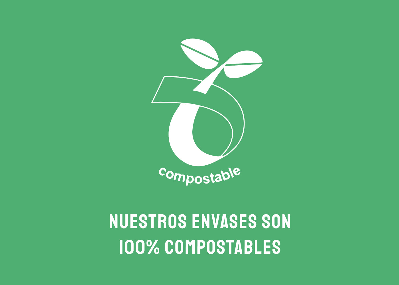 Por otra parte, nuestros envases son 100% compostables, es decir lo puedes incluir en tu compostera.